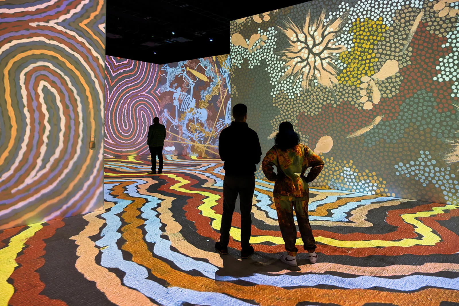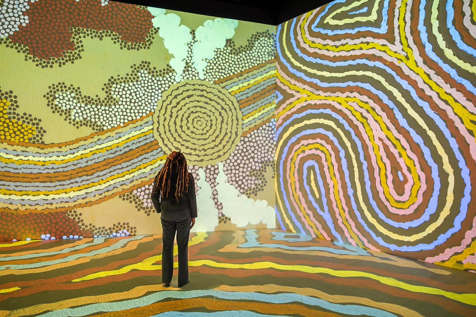 Imagine stepping into a vast, 30,000-square-foot space filled with over 500 pieces of artwork projected onto every surface. Surrounded by paintings, photographs and contemporary art, you’ll find yourself immersed in intricate details, vibrant colours, and profound messages of Australian First Nations creators, all set to a soundtrack composed of both traditional and modern Australian First Nations music.